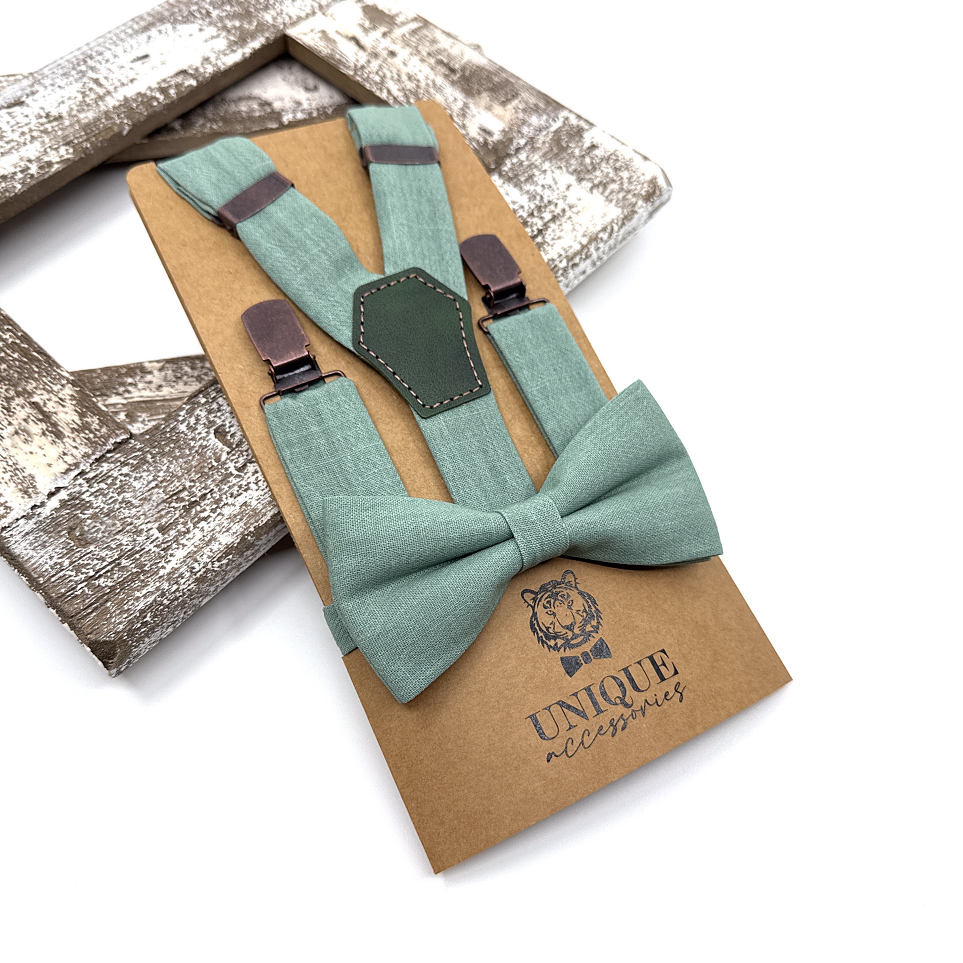 Cambridge Blue Suspenders, Linen Suspender Bowtie Set, Suspender Necktie, Wedding Suspenders, Groomsmen Suspenders