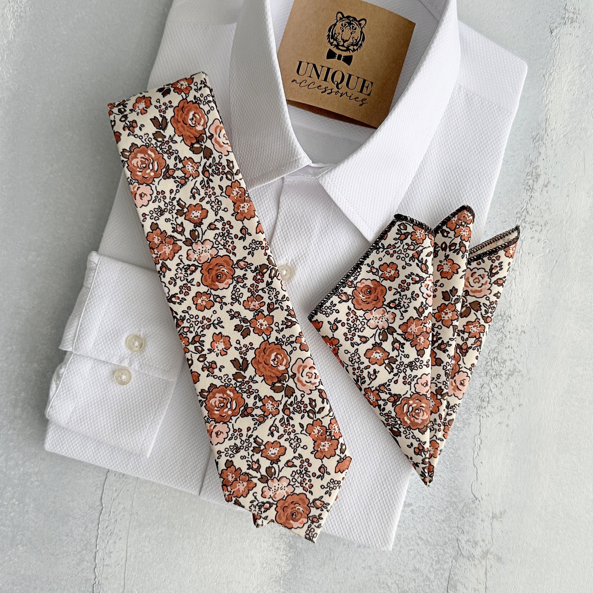 Rust Floral Tie & Pocket Square – Terracotta Wedding Necktie Set for Men